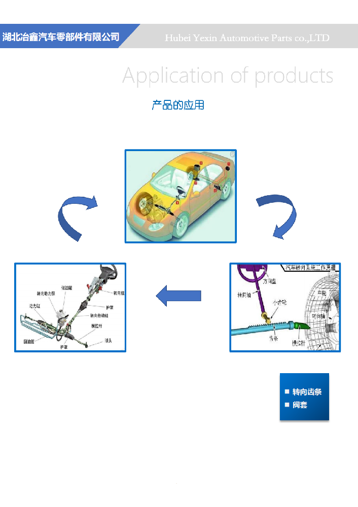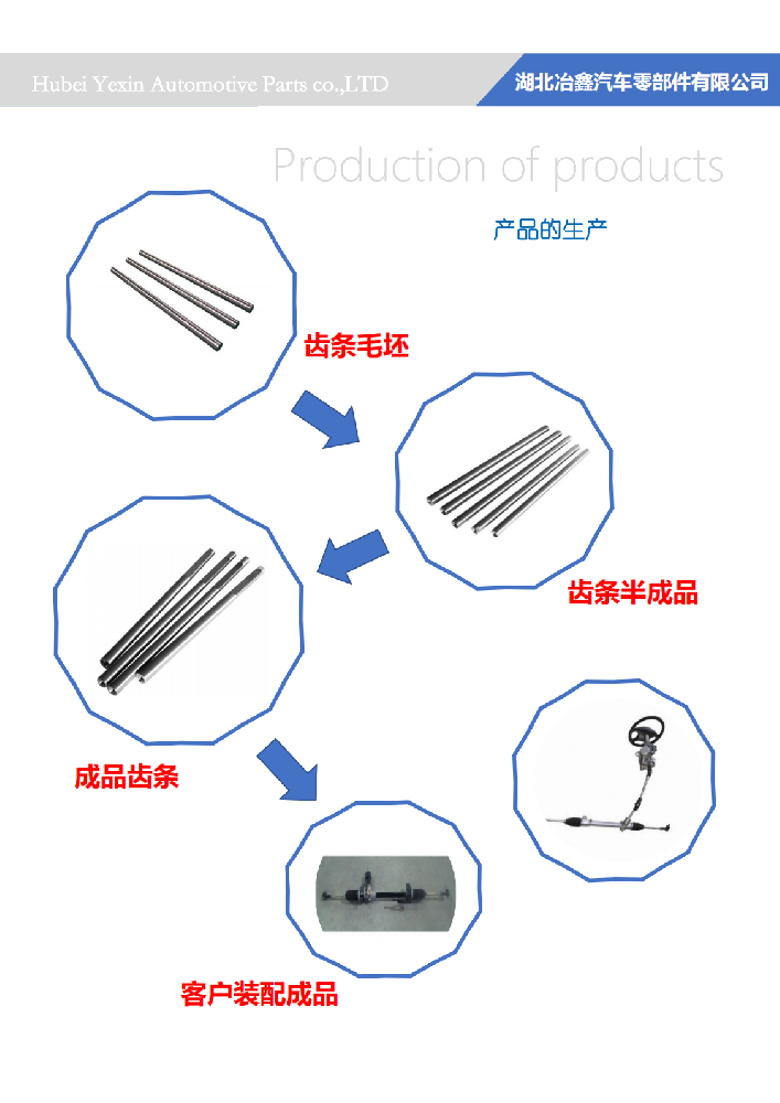 湖北冶鑫汽车零部件有限公司成立于2011年,是从事汽车转向器齿条、输 入轴及阀套等高精度保安杆件、零部件研发、生产和销售高新技术企业。公司 拥有现代化调质生产线、银亮生产线、高精度下料线及相关的检测设备。具备 万余吨(500万件)转向器零部件的生产能力。主要原材料是战略合作伙伴大 冶特殊钢股份有限公司提供。 公司位于中国矿冶名都湖北省黄石市,占地30亩。公司拥有各类技术、专 业人员70余人。公司...